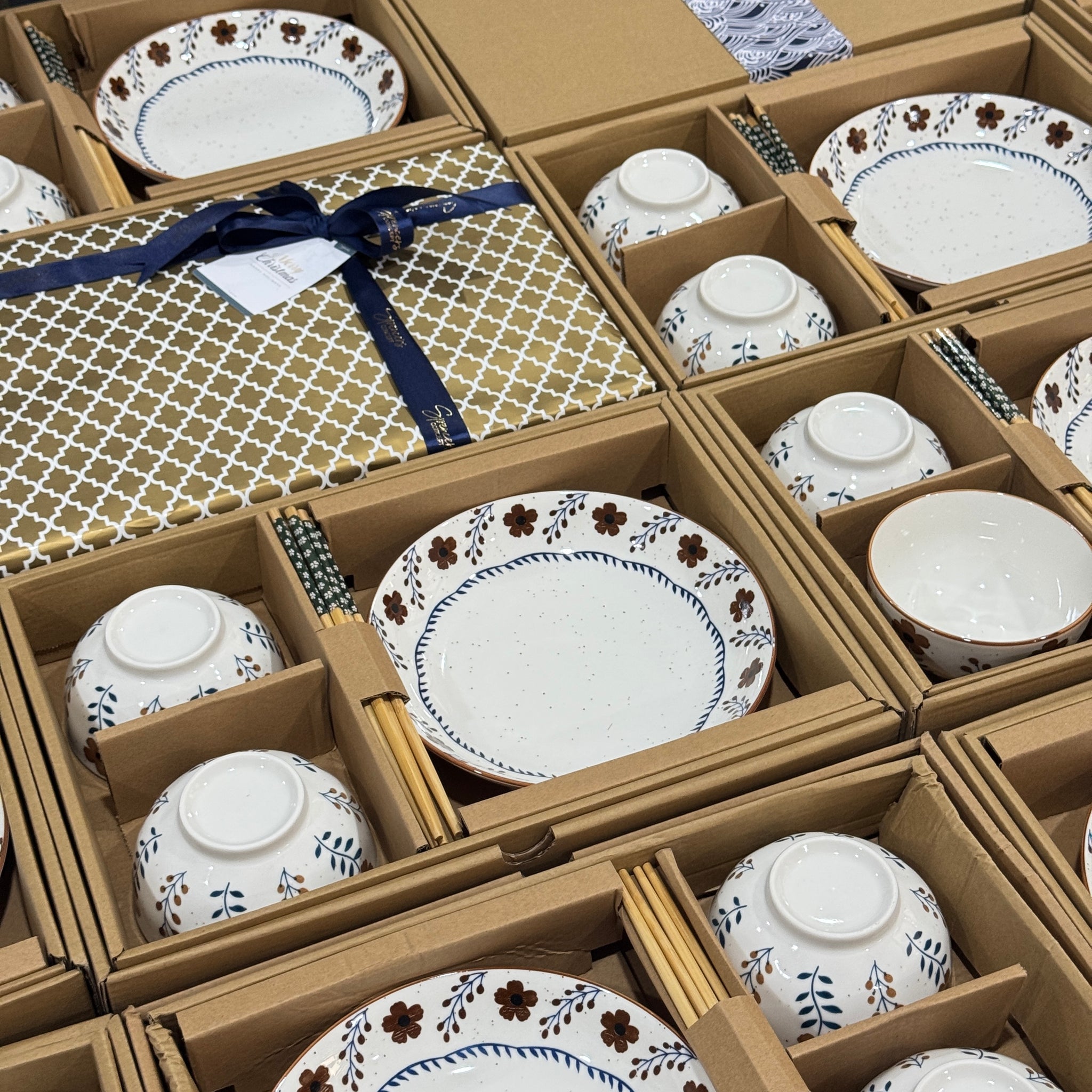 ELI B: Floral 3-pc plate + bowl set w/ chopsticks