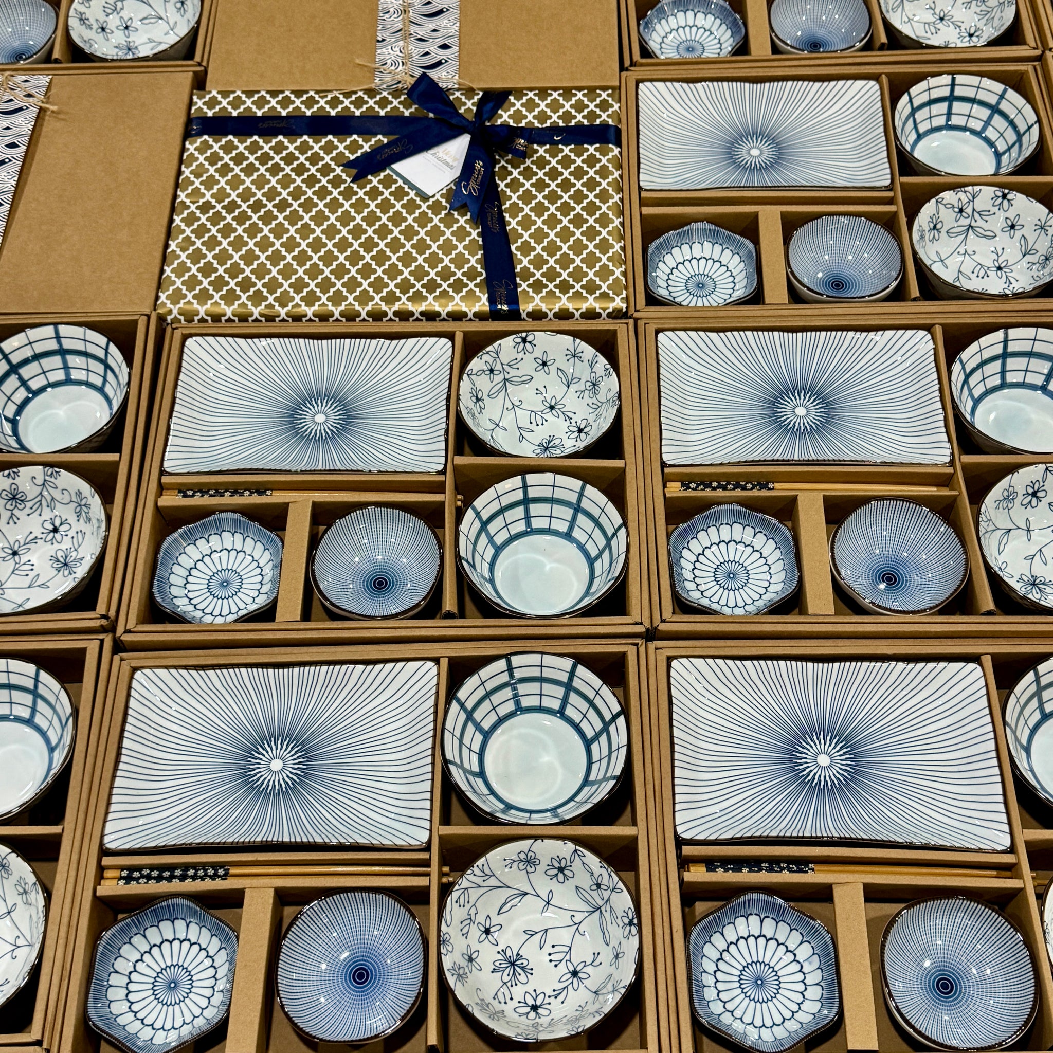 ELI A: Japanese (blue) 5 pc platter + bowl + saucer set